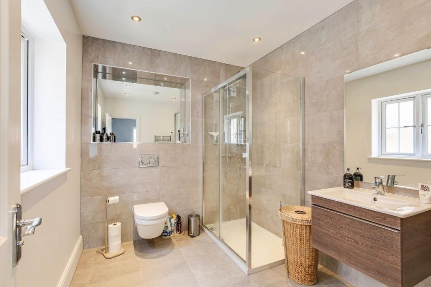At the heart of the property is a striking 34' x 14' German-designed kitchen and breakfast room, fitted with high-end appliances and sleek cabinetry perfect for both casual meals and entertaining. Adjoining the kitchen is a practical utility room, complementing the home's overall functionality. The spacious layout also includes a formal dining room and a versatile study that can double as a sixth bedroom if required. The wonderful living room provides a tranquil living space with a wood burner and surround as the centre piece. There are 5 double bedrooms, one currently operating as a dressing room with fitted wardrobes and the principal bedroom also has fitted wardrobes as well as a large en-suite.